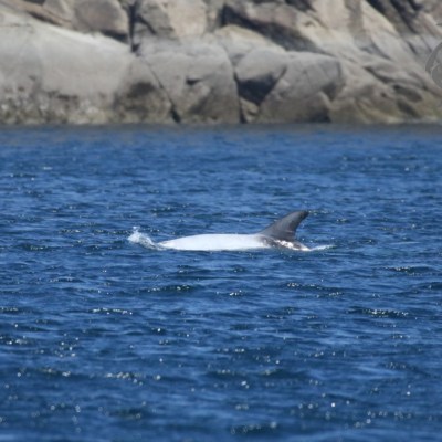 Our Discovery Voyage trip this morning was very productive, with perfect sailing conditions and sunny weather – though still cold! We had a great encounter with common dolphins further out, and Duncan spotted a minke whale though it was too quick for the passengers to see. Close to the coast we found a group of Risso’s dolphins, about eight in total including two small calves. They looked so white against the dark blue sea. There were also three seals hauled out on the island. We also saw the Brioc medieval sailing vessel as they sailed past Cornwall on their pan Celtic voyage. On the Bay Discovery we sailed along the coast further west than we normally do on the two hour trip, hoping to find the Risso’s again, but they had headed off somewhere else. We did have lovely views of the seals again as they slept undisturbed on the rocks, and also some of the newly hatched gull chicks.